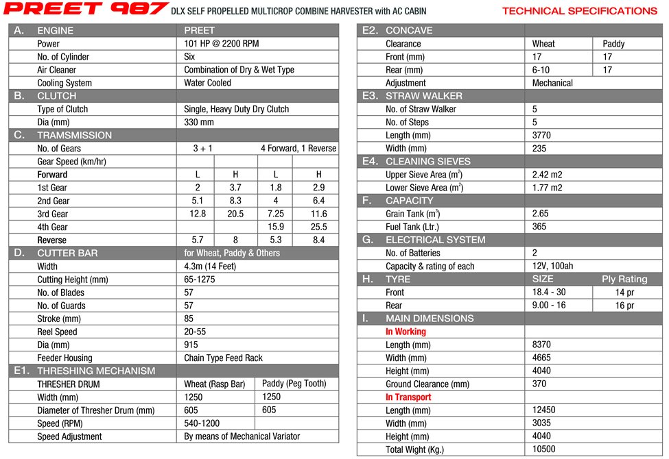 The all new PREET 987 - Deluxe Model combine harvester with AC Cabin is the true leader of crop harvesters. It represents the best performance, productivity and serviceability available at the moment. PREET 987 - Deluxe Model is loaded with most advanced features. This Multicrop Combine Harvester is designed for harvesting all traditional grain crops like Wheat, Paddy, Soyabean, Sunflower and Mustrad etc. Some of the features are as under: Engine Cooling by Clean Air through Rotating Sieve. Hydraulically Operated Discharge Tube. Heavy Duty 5 Speed Single Lever Gear Box. Folding Type Stanless Steel Elevators. Heavy Duty Reel. Wide Straw Walker. Thourough Threshing, No Grain Breakage. Large Sieve Area for Optimum Grain Cleaning. Small Turning Radius. Power Steering. Heavy Duty Chassi. Disk Brake. Good maneuverability in the Wet and Soft Fields. Well adaptation to the crops of slightly wet, lodged, or hard to thresh. New Graphics with New Color.PREET 987 - Deluxe Model with AC Cabin features a high-power 6-cylinder Diesel Engine (110 PS @ 2200 RPM). A large Torque Reserve, Simple Design, Low Maintenance Costs are coupled with High Fuel Efficiency and Friendly to the Environment. Clean grain is stored in a large-capacity (2.52 m) grain tank. Such capacity increases performance efficiency by reducing unload cycles. Improved Augar System for Quick Unloading of grains into trucks and trailers.