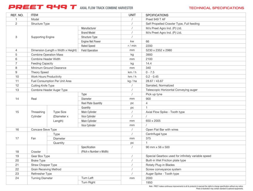 The facelifted PREET 949T Yuvraj Track Combine Harvester Technology is the most successful Paddy Harvester. It represents the best performance, productivity and serviceability available at the moment. PREET 949 is India's most reliable track combine harvester now with new features and color. This Track Combine Harvester is designed for harvesting Paddy Crops in Wet/Soft fields. Some of the features are stated as under: Large Sieve Area for Optimum Grain Cleaning. Hydraulic Flow through Hose Pipes. Stainless Steel Chasis. Reliable Drive Train. Faster Unloading System. High Capacity Hydraulic System. High Ground Clearance. Most Modern Operational Efficiency. Available in Single Stage and Double Stage Reduction option. Good maneuverability in the Wet and Soft Fields. Best Quality Crop Cutting Blades. PREET 949T Yuvraj Track Combine Harvester features a high-power Four Cylinder Diesel Engine (76 PS @ 2200 RPM). A large Torque Reserve, Simple Design, Low Maintenance Costs are coupled with High Fuel Efficiency and Friendly to the Environment. Clean grain is stored in a large-capacity grain tank. Such capacity increases performance efficiency by reducing unload cycles. Improved Augar System for Quick Unloading of grains into trucks and trailers. Threshing System with Flexible Concave ensures active separation with minimum damage to grains and straw, including in the most complex field conditions. The improved threshing system is makes sure consistent and gentle threshing without loss. Autonomous rethreshing unit will ensure that crops are harvested with minimal loss. Note: Technical Specification may change/update without any prior notice.