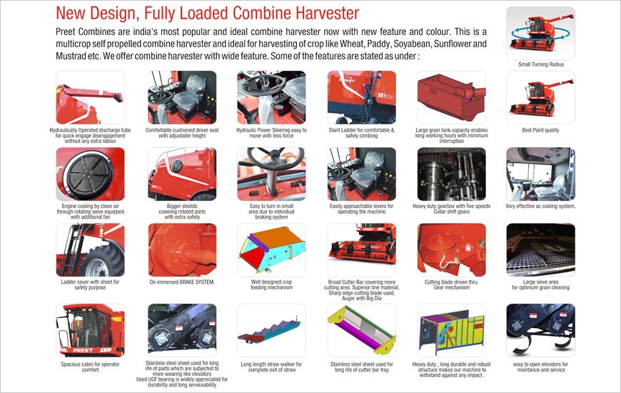 The all new PREET 987 - Deluxe Model combine harvester with AC Cabin is the true leader of crop harvesters. It represents the best performance, productivity and serviceability available at the moment. PREET 987 - Deluxe Model is loaded with most advanced features. This Multicrop Combine Harvester is designed for harvesting all traditional grain crops like Wheat, Paddy, Soyabean, Sunflower and Mustrad etc. Some of the features are as under: Engine Cooling by Clean Air through Rotating Sieve. Hydraulically Operated Discharge Tube. Heavy Duty 5 Speed Single Lever Gear Box. Folding Type Stanless Steel Elevators. Heavy Duty Reel. Wide Straw Walker. Thourough Threshing, No Grain Breakage. Large Sieve Area for Optimum Grain Cleaning. Small Turning Radius. Power Steering. Heavy Duty Chassi. Disk Brake. Good maneuverability in the Wet and Soft Fields. Well adaptation to the crops of slightly wet, lodged, or hard to thresh. New Graphics with New Color.PREET 987 - Deluxe Model with AC Cabin features a high-power 6-cylinder Diesel Engine (110 PS @ 2200 RPM). A large Torque Reserve, Simple Design, Low Maintenance Costs are coupled with High Fuel Efficiency and Friendly to the Environment. Clean grain is stored in a large-capacity (2.52 m) grain tank. Such capacity increases performance efficiency by reducing unload cycles. Improved Augar System for Quick Unloading of grains into trucks and trailers.
